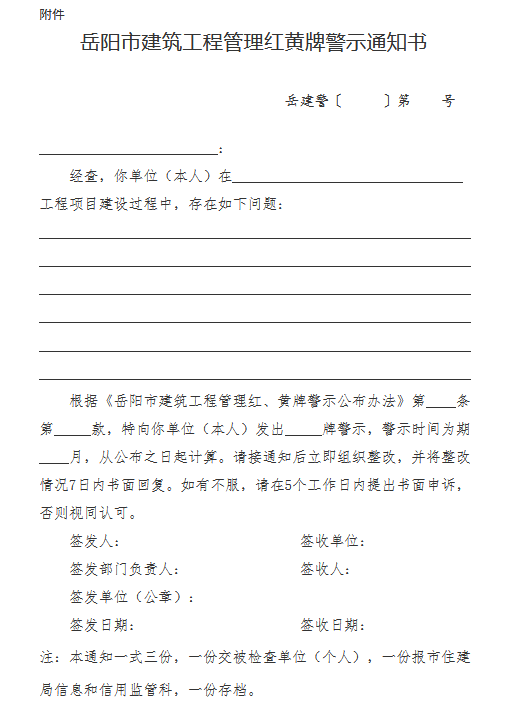 附件:《岳阳市建筑工程管理红黄牌警示通知书》