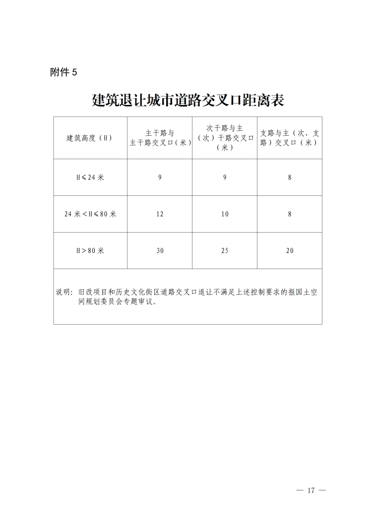 九、临城市道路交叉口周边应留出足够的开放空间,建筑退让城市道路交叉口距离按转角处道路红线直线段与曲线段的切点连线的垂直距离进行退让控制,其退让距离应符合最小距离的规定(见附件5)。