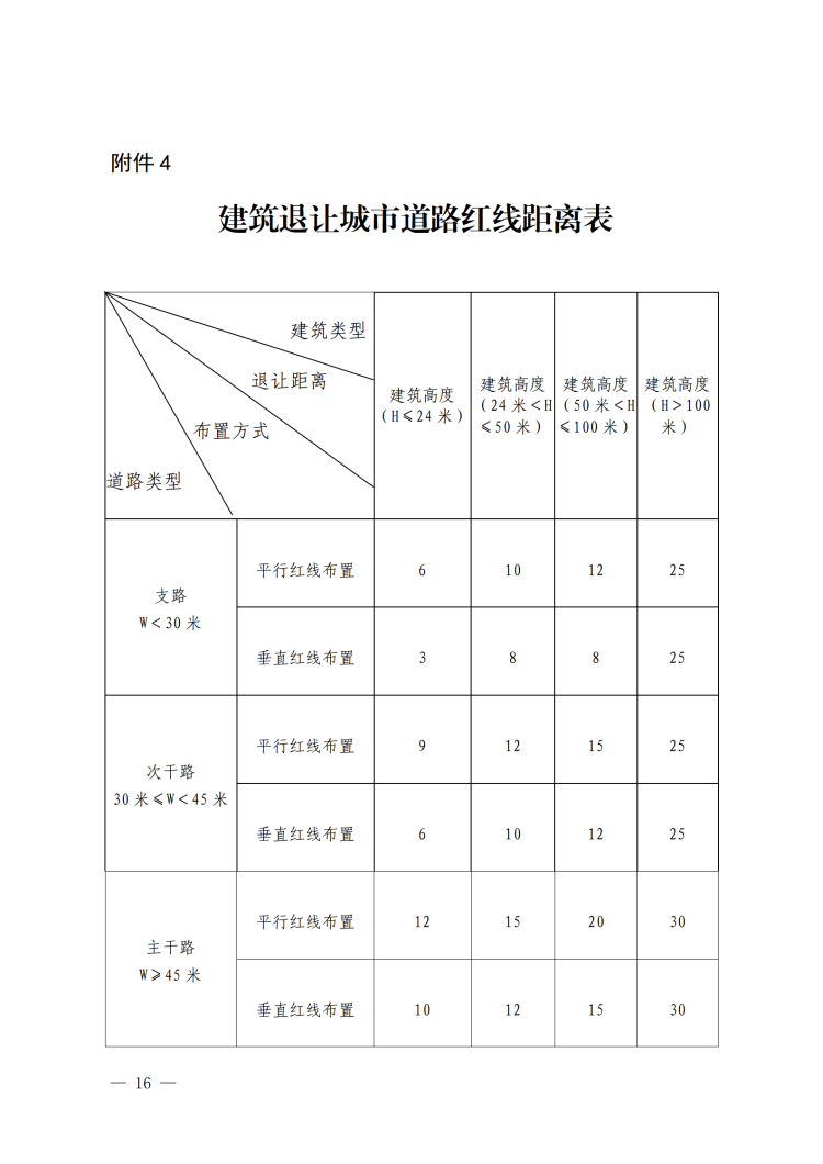 八、临街建筑退让城市道路红线距离按建筑高度和道路级别进行分类控制,其退让距离应符合最小距离的规定(见附件4)。