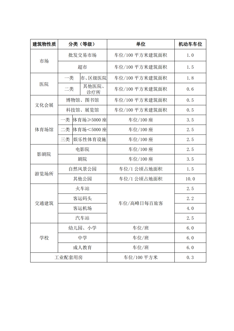 十九、市中心城区停车位的配建按照《岳阳市中心城区停车位配建标准》(见附件6)执行,表中未明确的事项或所列事项不明确的,由市资规局根据具体情况核定停车位配建标准。改(扩)建建筑物总面积大于或等于500平方米的,除增加建筑面积的部分应按要求配建停车位外,按原建筑物面积配建停车位不足的,应在改(扩)建的同时,按不低于车位差额数的30%予以补建。学校及医院应设置即走即停车辆临时停靠点。