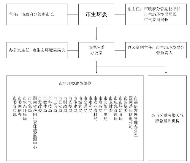 “岳阳市生态环境保护委员会(以下简称市生环委)统一领导、指挥和组织协调全市重污染天气应对工作。”将2.1.1市指挥部组成修改为“2.1.1市生环委组成 市生环委由市政府分管副市长任主任,市政府分管副秘书长、市生态环境局局长、市气象局局长任副主任,市委宣传部、市委网信办、市生态环境局、市气象局、湖南省岳阳生态环境监测中心、市发改委、市教体局、市科技局、市工信局、市公安局、市财政局、市资规局、市住建局、市城管局、市交通局、市水利局、市农业农村局、市商务局、市文旅广电局、市卫健委、市应急管理局、市市场监管局、市国资委、国网岳阳供电公司、市通信发展管理办公室等有关部门单位负责人为成员。根据工作需要,可增加市级有关部门单位负责人为市生环委成员。市生环委办公室设在市生态环境局,由市生态环境局局长兼任办公室主任。”《预案》中的“市指挥部”和“市指挥部办公室”分别统一修改为“市生环委”和“市生环委办公室”;“指挥长”统一修改为“主任”;“省重污染天气应急指挥中心”统一修改为“省重污染天气应急指挥机构”。