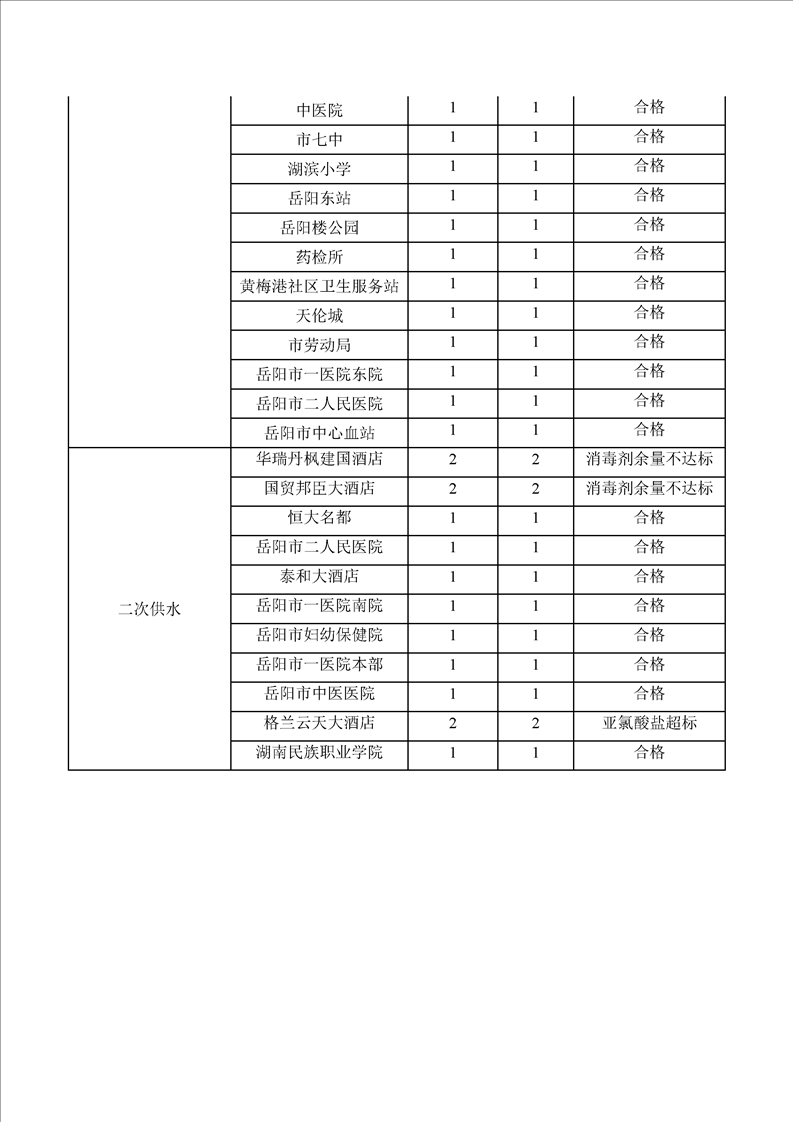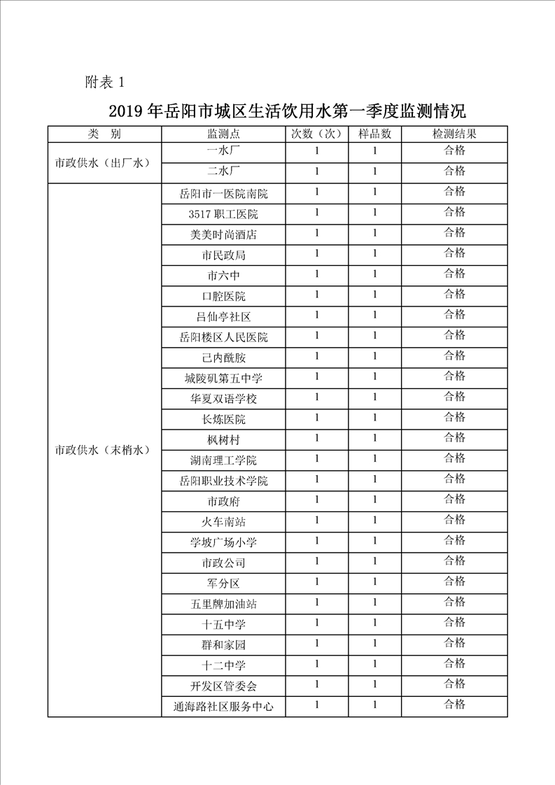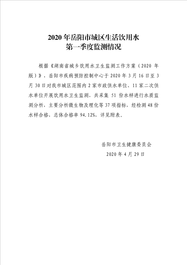 岳阳市城区生活饮用水2020年第一季度监测情况