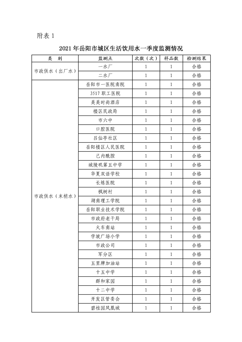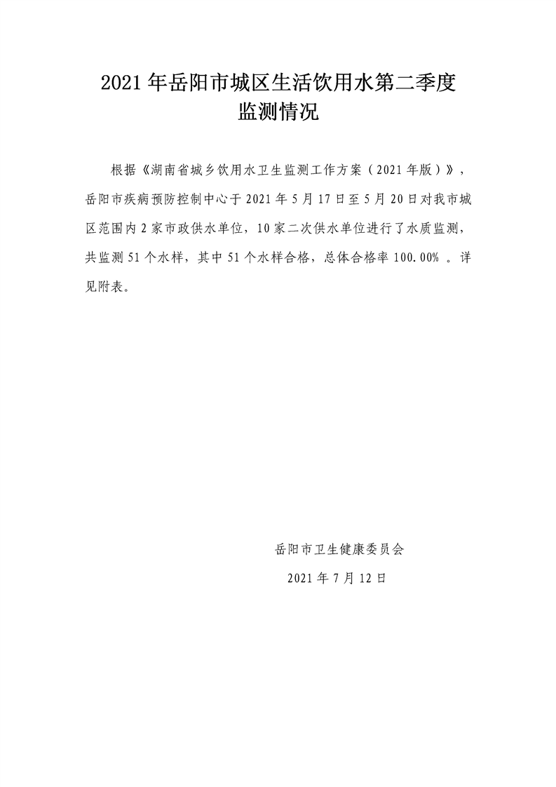 岳阳市城区生活饮用水2021年第二季度监测情况