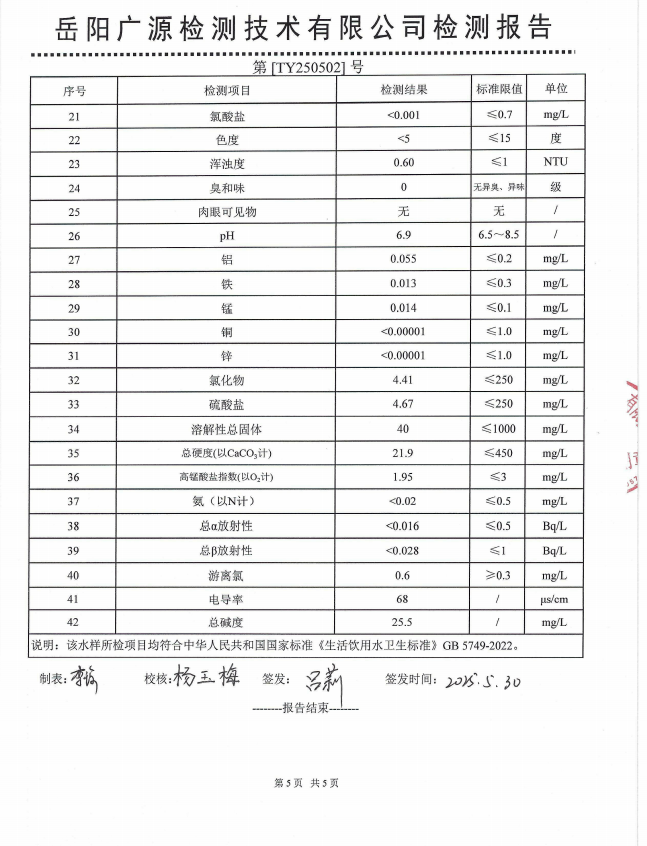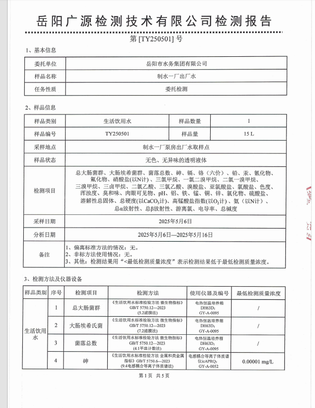 2025年5月岳阳市水务集团出厂水水质检测月报表