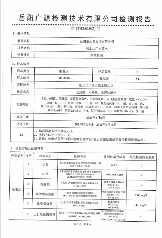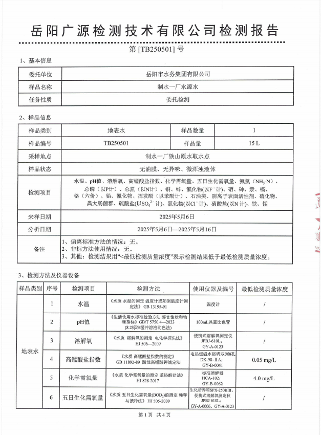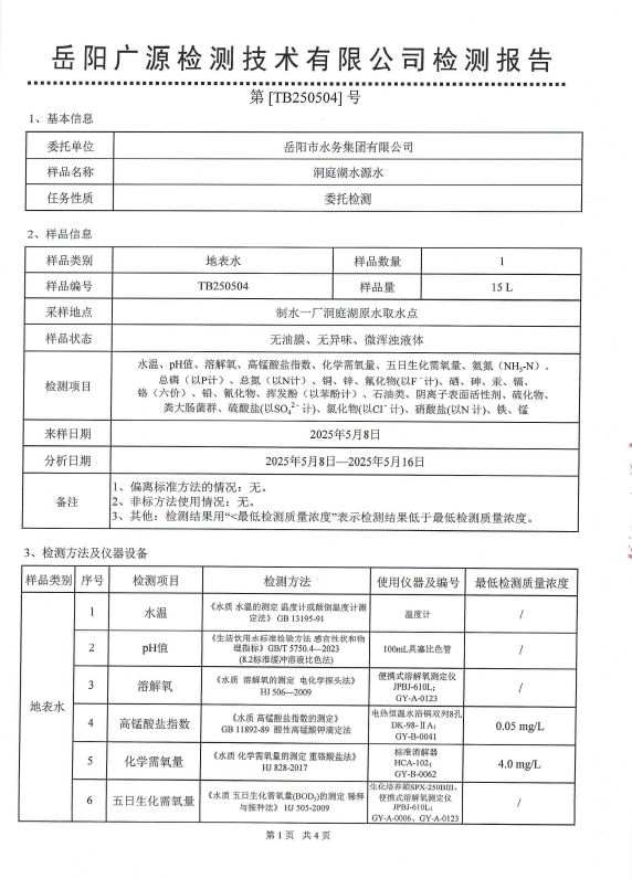 2025年5月岳阳市水务集团水源水水质检测月报表