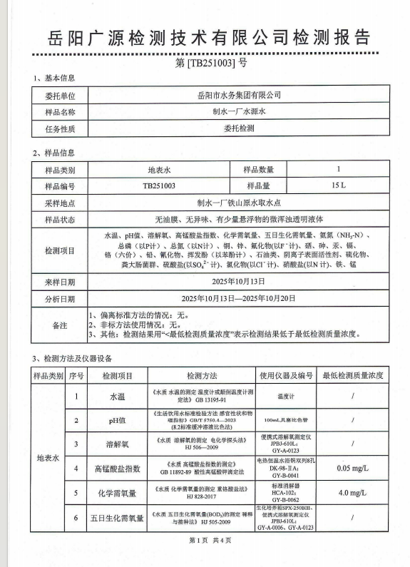 2025年10月岳阳市水务集团水源水水质检测月报表