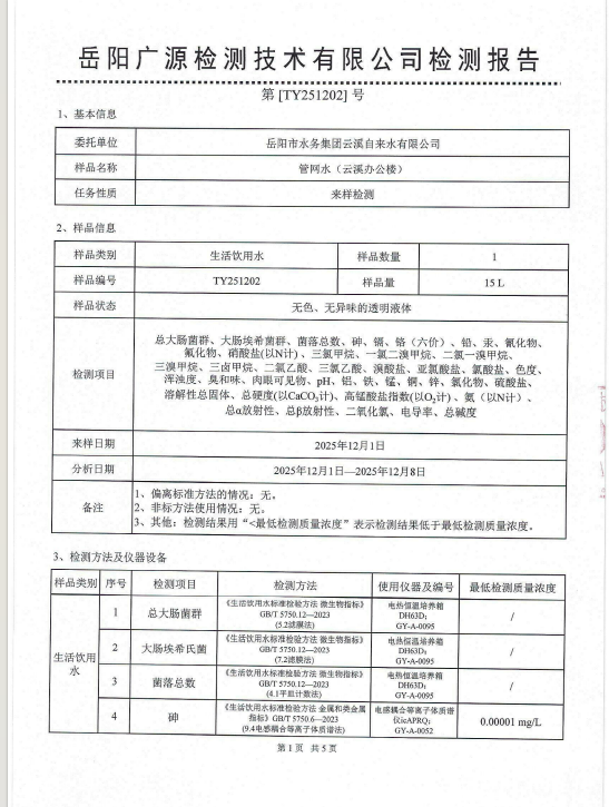 2025年12月岳阳市水务集团管网水水质检测月报表