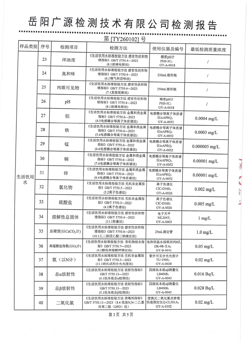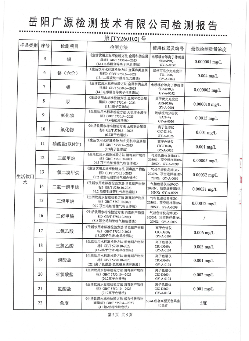 2026年1月岳阳市水务集团管网水水质检测月报表