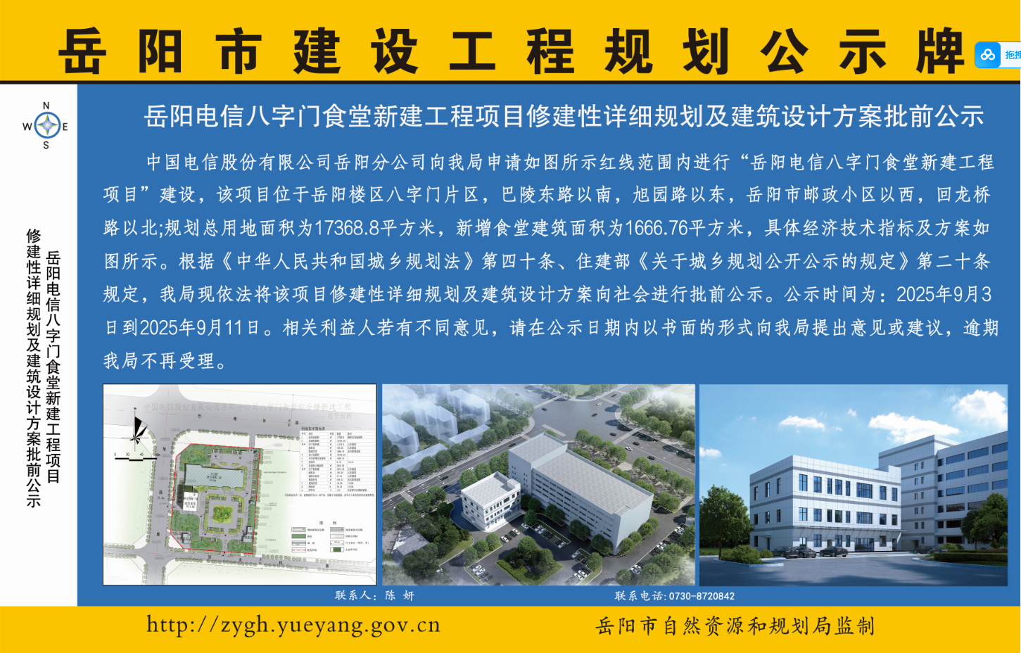 岳阳电信八字门食堂新建工程项目修建性详细规划及建筑设计方案批前公示