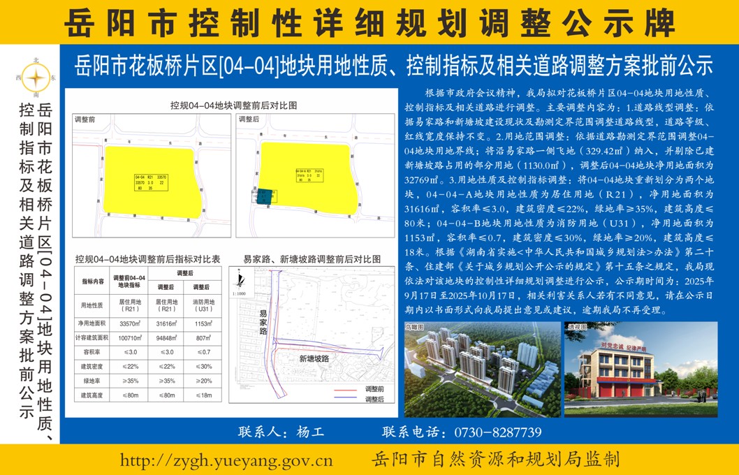 岳阳市花板桥片区04-04地块用地性质、控制指标及相关道路调整方案批前公示