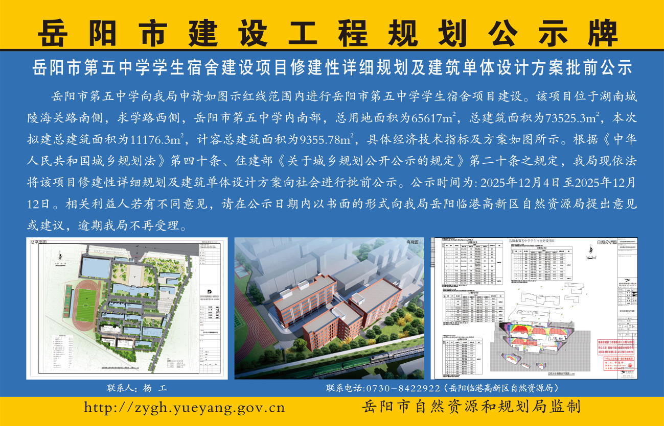 岳阳市第五中学学生宿舍建设项目修建性详细规划及建筑单体设计方案批前公示