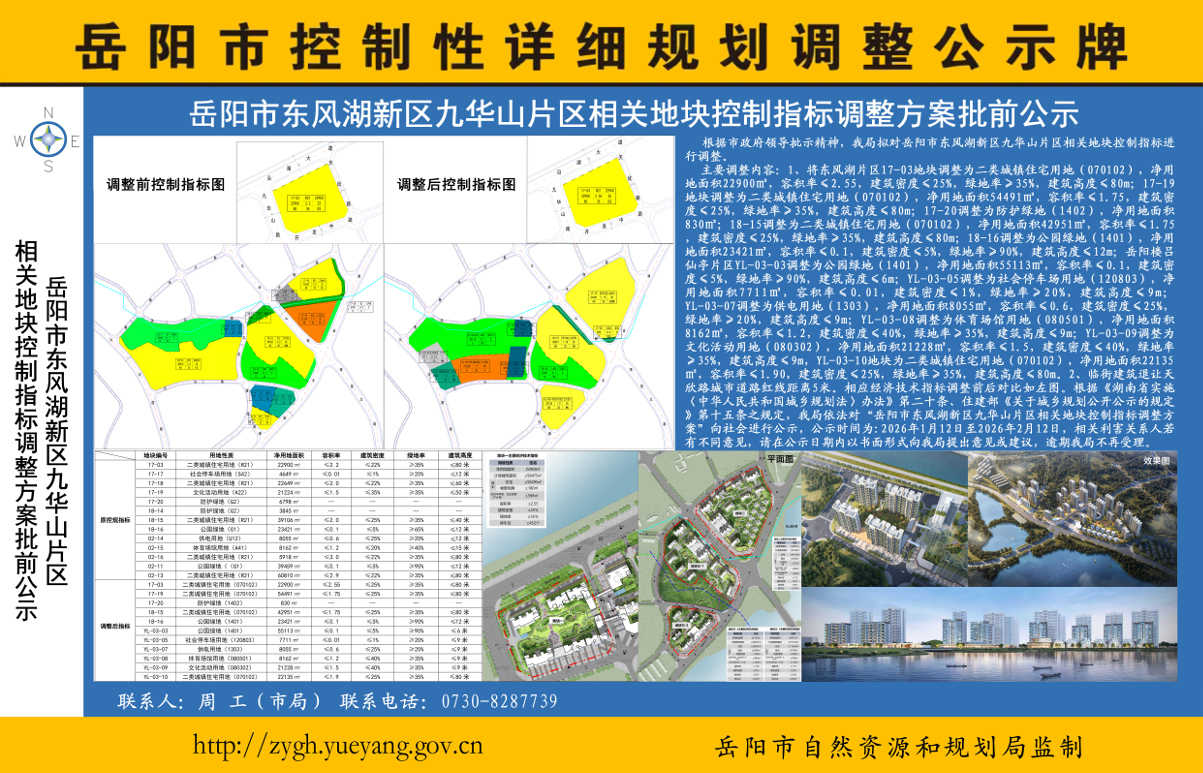 岳阳市东风湖新区九华山片区相关地块控制指标调整方案批前公示