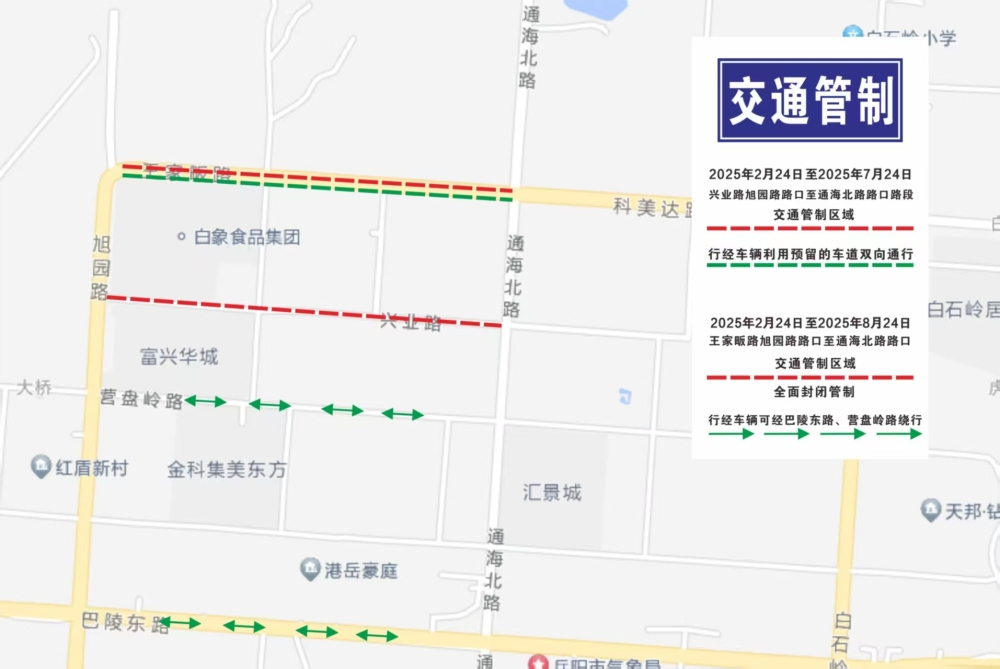 交通管制期间,王家畈路管制路段行经车辆利用预留的车道双向通行;兴业路管制路段行经车辆可经巴陵东路、营盘岭路绕行。