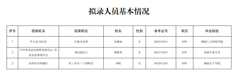 岳阳市2022年考试录用公务员暂缓录用考生朱康丽等3名同志拟录用公示