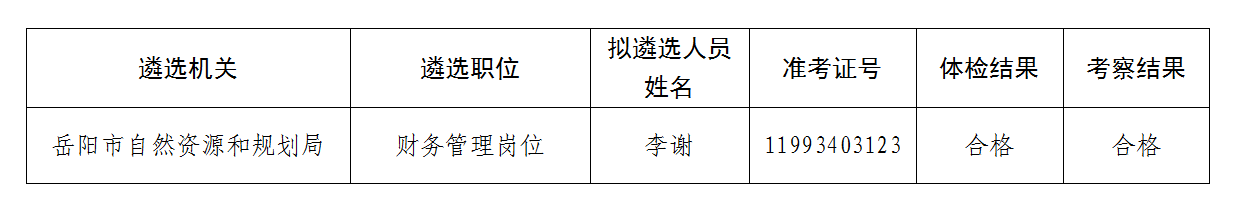 根据《2022年岳阳市市直机关公开遴选公务员公告》要求,经笔试、面试、体检、考察、遴选机关党组集体研究等程序,现确定递补李谢同志为拟遴选人员,现按要求予以公示: