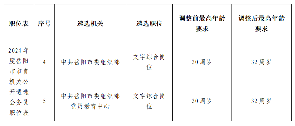 经研究决定,现将中共岳阳市委组织部文字综合岗位(职位序号4)、中共岳阳市委组织部党员教育中心文字综合岗位(职位序号5)2个岗位的最高年龄要求由30周岁调整为32周岁,其他事项按照《2024年度岳阳市市直机关公开遴选公务员公告》执行。