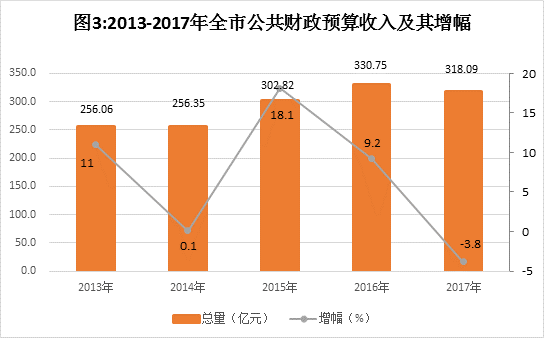 财政收入运行稳健。全年全市公共财政预算收入318.09亿元,比上年减少12.66亿元,下降3.8%,其中税收收入243.44亿元,减少3.81亿元,下降1.5%。地方公共财政预算收入152.14亿元,比上年增加0.1亿元,增长0.1%,其中税收收入78.94亿元,增加8.65亿元,增长12.3%。