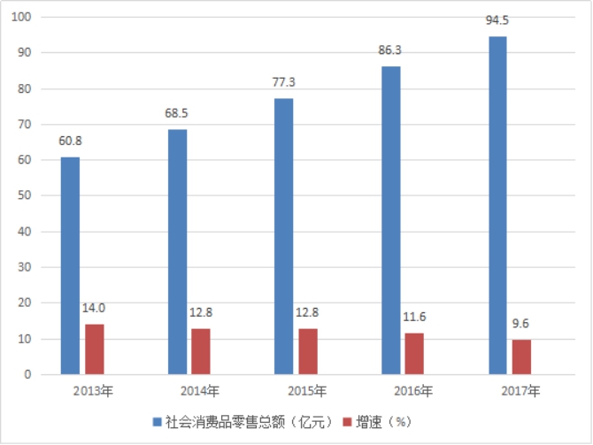 图4 2013-2017年社会消费品零售总额及增速