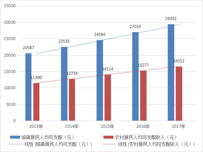 图5 2013-2017年城镇居民人均可支配收入和农村居民人均可支配收入