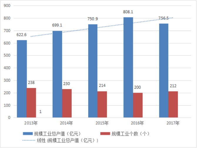 图2 2013-2017年规模以上工业总产值及企业个数
