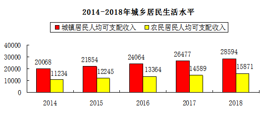 全年城镇居民人均可支配收入28594元,增长8%;农村居民人均可支配收入15871元,增长8.8%。