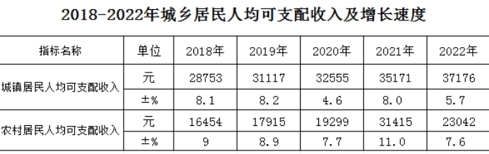 全县城乡居民人均可支配收入29534元,同比增长6.5%,按常住地分,城镇居民人均可支配收入37176元,同比增长5.7%;农村居民人均可支配收入23042元,同比增长7.6%。2022年全县居民人均消费支出17180元,比上年增长6.3%,按常住地分,城镇居民人均消费支出17209元,增长4.6%;农村居民人均消费支出17156元,增长7.7%。