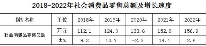 全县全年实现社会消费品零售总额156.85亿元,同比增长2.6%。按所在地分:城镇社会消费品零售额同比增长2.5%;乡村社会消费品零售总额同比增长2.7%。按行业分:批发业销售额同比增长1.6%;零售业销售额同比增长2.8%;住宿业同比增长1.8%;餐饮业同比增长2.2%。
