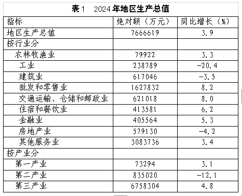 根据地区生产总值统一核算结果,全年地区生产总值766.66亿元,比上年增长3.9%。其中:第一产业增加值7.33亿元,增长3.1%;第二产业增加值83.50亿元,下降12.1%;第三产业增加值675.83亿元,增长4.8%。按常住人口计算,人均地区生产总值118872元,下降5.1%。