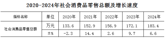 全县全年实现社会消费品零售总额183.41亿元,同比增长6.6%。按所在地分:城镇社会消费品零售额同比增长6.4%,乡村社会消费品零售总额同比增长7.1%。按行业分:批发业销售额同比增长5.9%,零售业销售额同比增长6.0%,住宿业同比增长9.7%,餐饮业同比增长9.1%。
