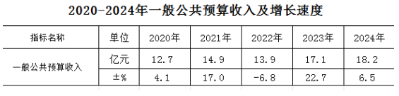 全县一般公共预算收入18.17亿元,同比增长6.5%。一般公共预算地方收入11.23亿元,同比增长10.1%。税收收入15.84亿元,占一般公共预算收入的87.1%。