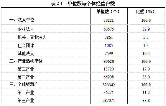 2023年末,全市共有从事第二产业和第三产业活动的法人单位73221个,比2018年末增加19262个,增长35.7%;产业活动单位[1]80628个,增加21586个,增长36.6%;个体经营户323342个(详见表2-1)。