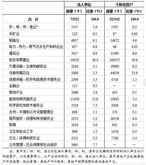 在第二产业和第三产业法人单位中,位居前三位的行业是:批发和零售业19332个,占26.4%;租赁和商务服务业11456个,占15.6%;制造业6657个,占9.1%。在个体经营户中,位居前三位的行业是:批发和零售业163475个,占50.6%;住宿和餐饮业44856个,占13.9%;居民服务、修理和其他服务业28559个,占8.8%(详见表2-2)。