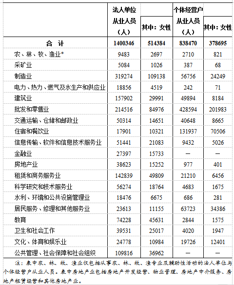 在第二产业和第三产业法人单位从业人员中,位居前三位的行业是:制造业31.93万人,占22.8%;批发和零售业21.45万人,占15.3%;建筑业15.79万人,占11.3%。在个体经营户从业人员中,位居前三位的行业是:批发和零售业42.86万人,占51.1%;住宿和餐饮业13.19万人,占15.7%;居民服务、修理和其他服务业6.37万人,占7.6%(详见表2-3)。