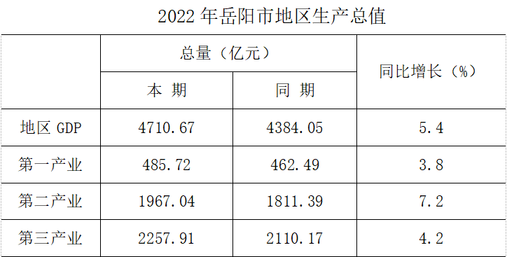 根据地区生产总值统一核算结果,2022年岳阳市地区生产总值4710.67亿元,按可比价格计算,同比增长5.4%。分产业看,第一产业增加485.72亿元,增长3.8%;第二产业增加值1967.04亿元,增长7.2%;第三产业增加值2257.91亿元,增长4.2%。