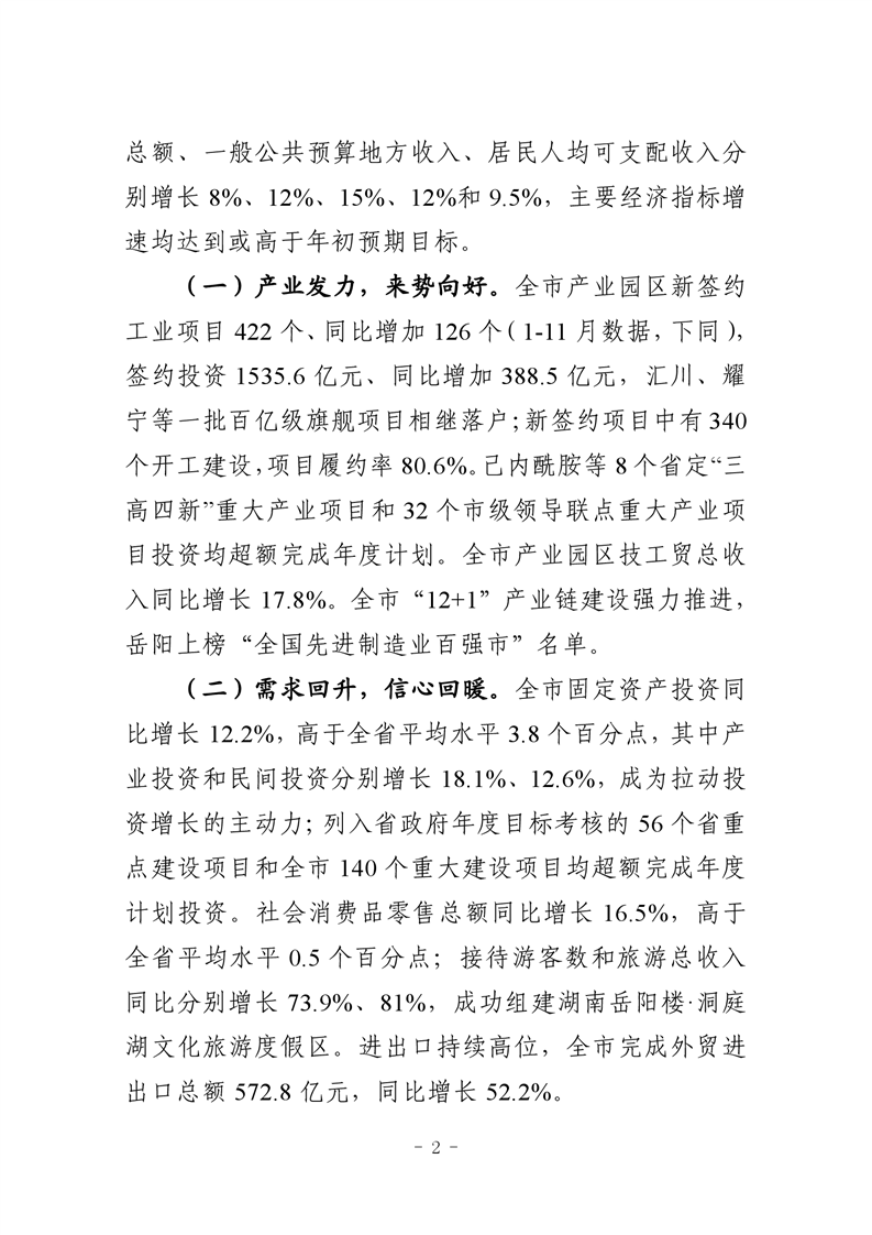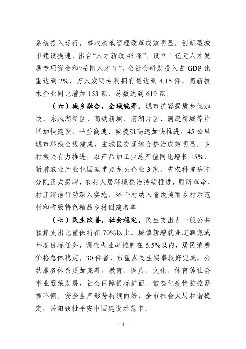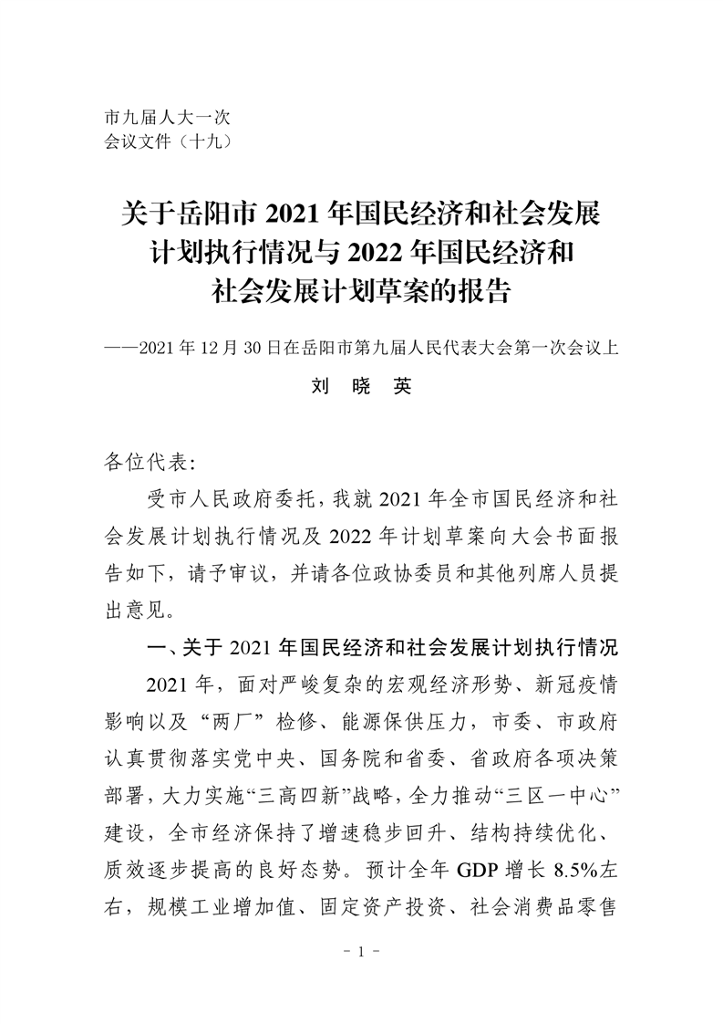关于岳阳市2021年国民经济和社会发展计划执行情况与2022年国民经济和社会发展计划草案的报告
