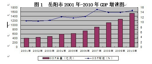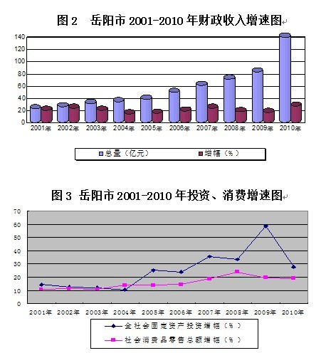 ――经济实力实现历史性跨越。全市经济增长质量和效益同步提高。地区生产总值年均增长14.1%,2010年达到1539.4亿元;社会消费品零售总额达到507亿元,年均增长18.7%;固定资产投资累计完成2352亿元,年均增长32.4%;财政总收入达到139.6亿元,年均增长27.5%。岳阳被国家统计局评为新中国成立60年60个城市发展代表之一。县域经济快速发展。2010年县域经济总量超过900亿元,占全市GDP比重提高到58.7%,汨罗、华容和岳阳县进入全省经济强县,临湘和湘阴进入全省县域经济发展先进县市区。