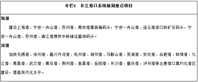 (三)促进港口合理布局。优化港口功能,加强分工合作,积极推进专业化、规模化和现代化建设,大力发展现代航运服务业。加快上海国际航运中心、武汉长江中游航运中心、重庆长江上游航运中心和南京区域性航运物流中心建设。推进上海港、宁波—舟山港、江苏沿江港口功能提升,有序推进内河主要港口建设,完善集装箱、大宗散货、汽车滚装及江海中转运输系统。