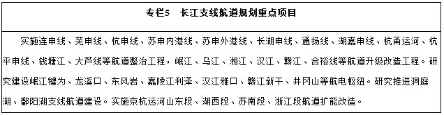 (二)统筹推进支线航道建设。积极推进航道整治和梯级渠化,提高支流航道等级,形成与长江干线有机衔接的支线网络。加快建设合裕线、信江、赣江、江汉运河、汉江、沅水、湘江、乌江、岷江等高等级航道,抓紧实施京杭运河航道建设和船闸扩能工程,系统建设长江三角洲地区高等级航道网络。研究论证金沙江攀枝花至水富、引江济淮通航和长江水系具有开发潜力航道升级改造的可能性。统筹推进其他支线航道建设。
