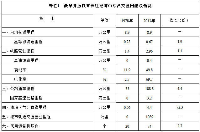 改革开放以来,长江经济带交通基础设施建设成效显著,路网规模持续扩大,结构布局不断改善,技术水平明显提升,运输能力大幅增强,初步形成了以长江黄金水道为依托,水路、铁路、公路、民航、管道等多种运输方式协同发展的综合交通网络。
