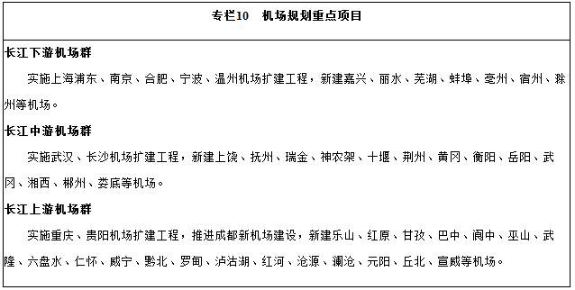 (三)拓展航空运输网络。加快上海国际航空枢纽建设,强化重庆、成都、昆明、贵阳、长沙、武汉、南京、杭州等机场的区域枢纽功能,发挥南昌、合肥、宁波、温州、无锡、丽江、西双版纳等干线机场作用,完善支线机场布局,形成长江上、中、下游机场群。优化航线网络,科学论证,提高主要城市间航班密度,增加国际运输航线。深化低空空域管理改革,发展通用航空。依托空港资源,发展临空经济。