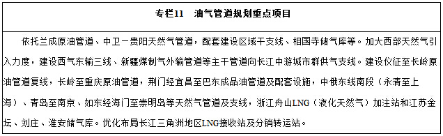 (四)完善油气管道布局。统筹规划、合理布局沿江油气管网,加快建设主干管道,配套建设输配体系和储备设施,提高原油、成品油管输比例,增加天然气供应能力。完善长江三角洲、长江中游、川渝云贵地区原油、成品油输送管道以及区域天然气管网,加快油气管道互联互通,形成以沿江干线管道为主轴,连接成渝城市群、长江中游城市群、长江三角洲城市群的油气供应保障体系。