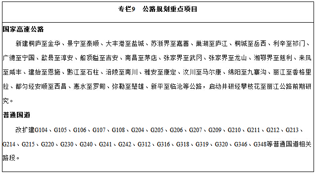 ——建成便捷的公路网络。形成以沪蓉、沪渝、沪昆、杭瑞高速公路为骨架的国家高速公路网和覆盖所有县城的普通国道网,实现具备条件的乡镇、建制村通沥青(水泥)路。
