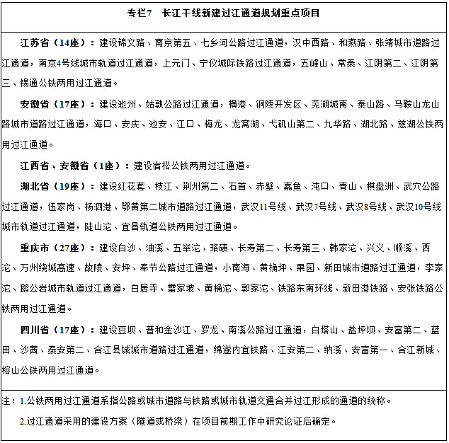 (六)增强长江干线过江能力。统筹规划、合理布局过江通道,做好隧道桥梁方案比选、洪水影响评价等论证工作,充分利用江上和水下空间,着力推进铁路、公路、城市交通合并过江,节约集约利用土地和岸线资源。优化整合渡口渡线,加强渡运安全管理。促进过江通道与长江航运、防洪安全和生态环境协调发展,实现长江两岸区域间、城市间以及城市组团间便捷顺畅连接,形成功能完善、安全可靠的过江通道系统。