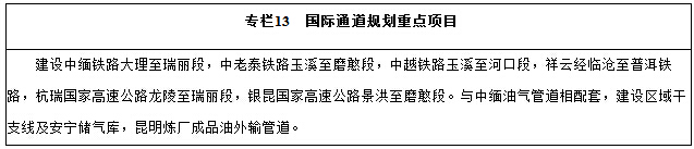 (六)建设国际运输通道。建设孟中印缅通道、中老泰通道和中越通道,加快基础设施互联互通。推进昆明至缅甸铁路、公路和油气管道建设,形成至南亚的国际运输通道。推进昆明至越南、老挝的铁路和公路建设,形成至东南亚的国际运输通道。开发利用国际河流航运资源,建设澜沧江、红河等水路国际运输通道。配套建设与国际通道相关的基础设施,完善口岸功能。