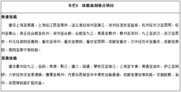 (一)强化铁路运输网络。加强快速铁路建设,重点建设上海经南京、合肥、武汉、重庆至成都的沿江高速铁路和上海经杭州、南昌、长沙、贵阳至昆明的沪昆高速铁路,建设商丘经合肥至杭州、重庆至贵阳等南北向高速铁路和快速铁路,形成覆盖50万人口以上城市的快速铁路网。