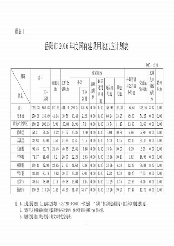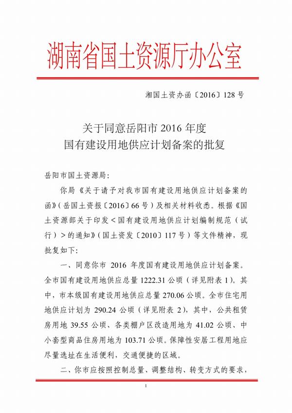 关于同意岳阳市2016年度国有建设用地供应计划备案的批复