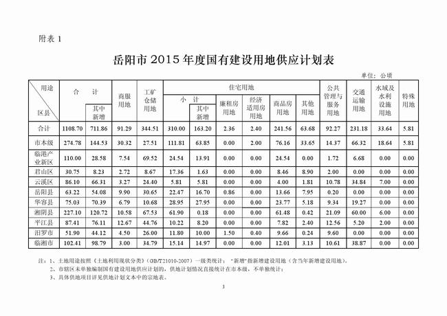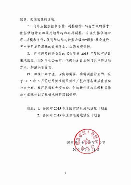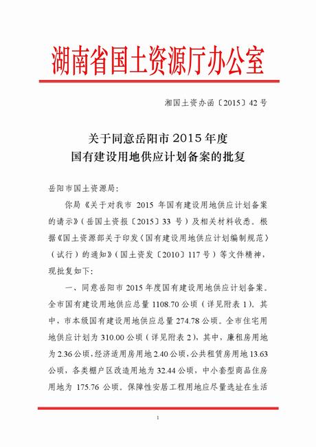 关于同意岳阳市2015年度国有建设用地土地供应计划备案的批复