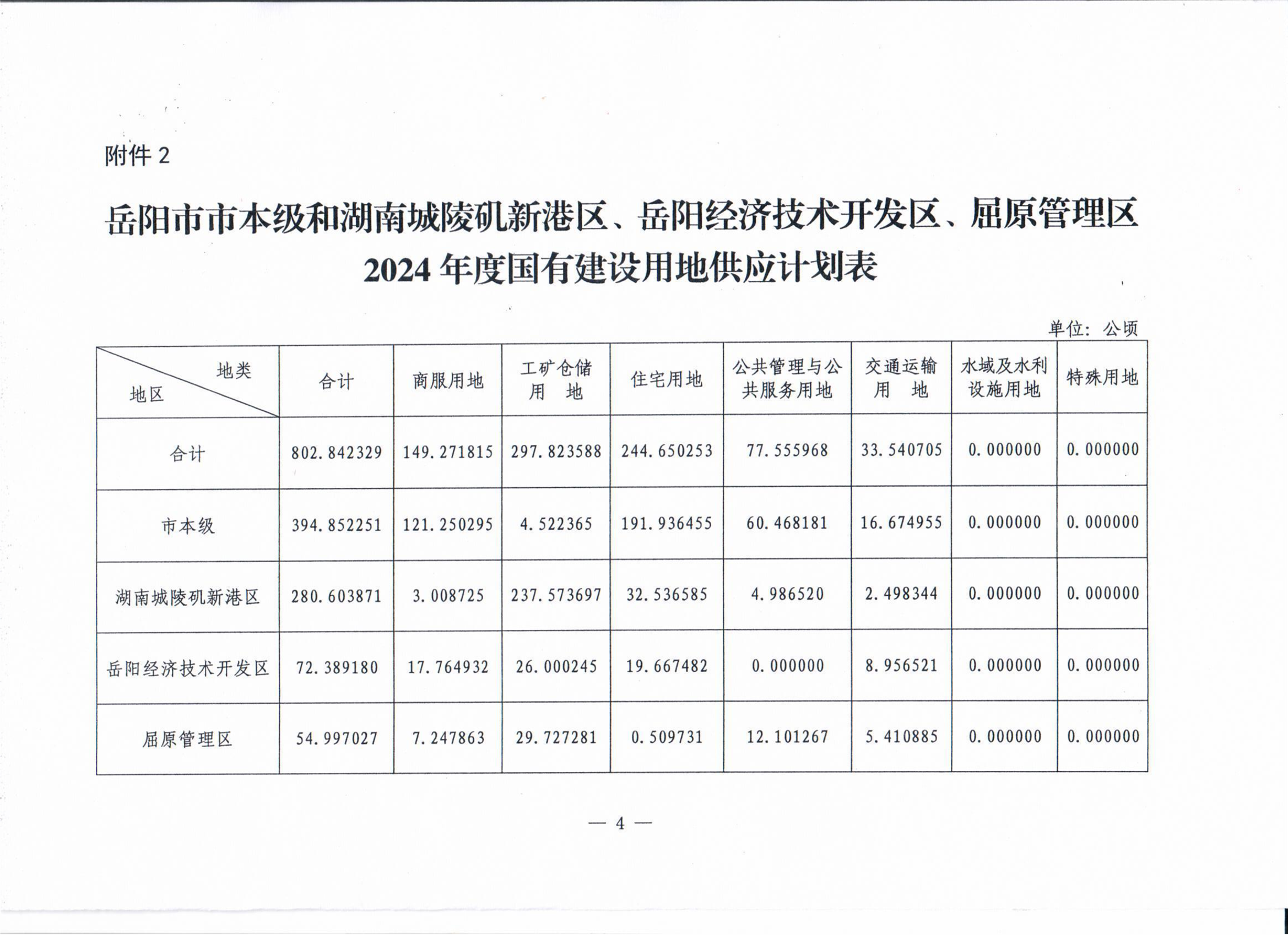 岳阳市市本级和湖南城陵矶新港区、岳阳经济技术开发区、屈原管理区2024年度全民所有土地资产管理计划和国有建设用地供应计划