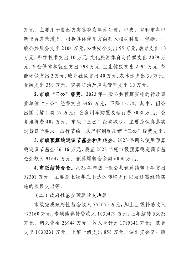 3、按照《预算法》规定需要报告的其它重点事项(含市级汇总“三公”经费决算情况、预备费使用情况等)